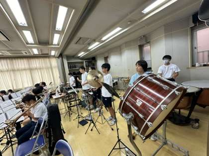 吹奏楽部は、8月3日の東京都中学校吹奏楽コンクールに向けて、練習しています。課題曲「フロンティア・スピリット」と自由曲「インヴィクタ」を合わせている様子です。