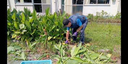 主事さん、午後は炎天下の中、校庭で草木の伐採です!