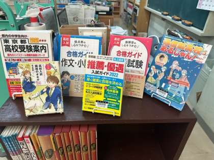 図書館では、新しく増設した部屋に、「お月見読書」というコーナーを作って、月に関する書籍を展示しています。また、受験対策の書籍を集めたミニコーナーもあります。展示が変わって、より使いやすくなった図書館にどうぞ足を運んでみてください。
