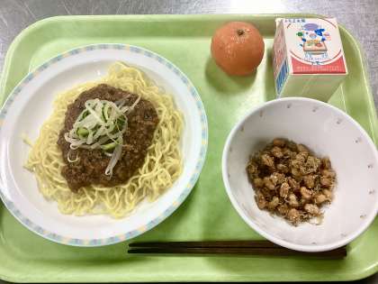 今日は最近の中では特に暑い日です。ジャージャー麺の上にのせるシャキシャキ野菜が、特においしく感じられるのではないでしょうか?デザートに冷凍みかんも付けているので、今日が暑くて良かったと思いました。熱中症だけはご注意を!
