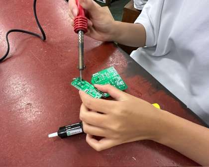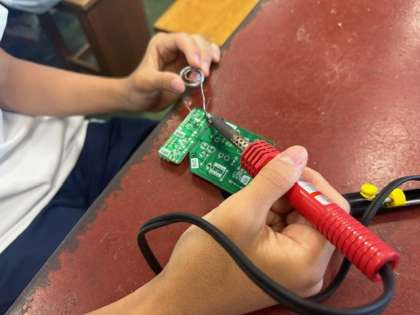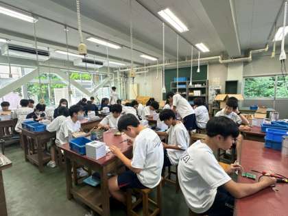 2年生の技術ではラジオを制作しています。はんだ付けの練習をしているところです。