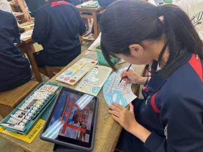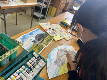 3年生の美術は、点描画で描く扇形の作品の最終段階です。修学旅行で行った、京都、奈良の思い出の場所を描いています。