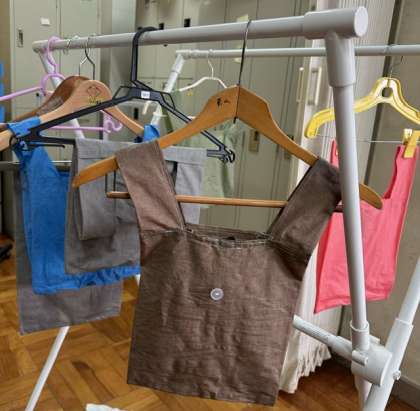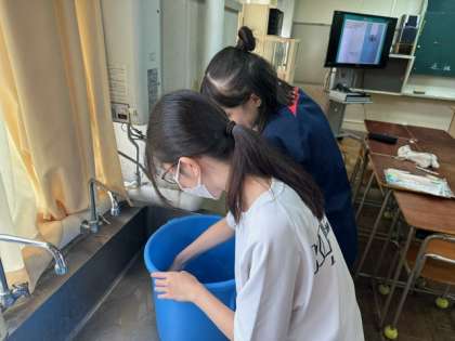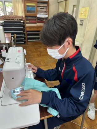 I組の家庭科の授業では、コンビニエコバッグを制作しています。今日は仕上げ段階です。ミシンが終わった人から、ボタンをつけて、水洗いをして、乾かして、完成です。