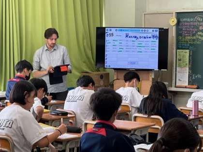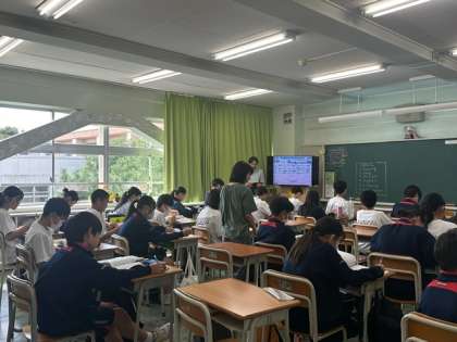 英語の授業では、ALTの先生が順番に入って学習します。ALTの先生に続いて、発音の練習をしているところです。
