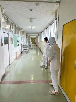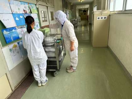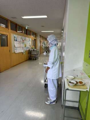 各クラス前に配膳を終えた後も、授業が終わって、クラスの中に運び入れるまで、見守ります。