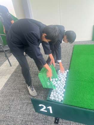 千歳ゴルフセンターの職場体験では、ボール集めや機材の入れ替えなどをしました。。休憩時間には、ゴルフの体験もさせていただきました。