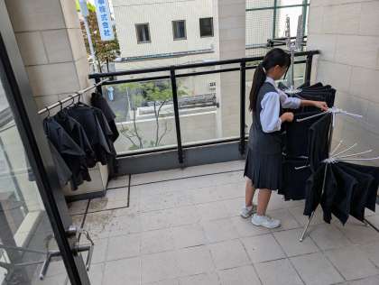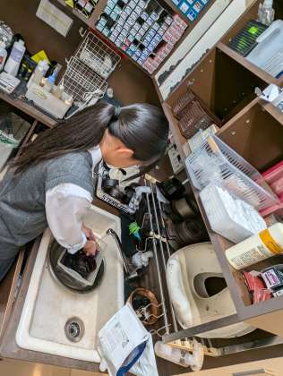 床に落ちた髪をほうきで集めたり、タオル干し、パーマに使われたブラシやカーラーの洗いや片付けなど、裏方仕事を中心に体験させていただきました。昨日はウィッグを使ってのコテ巻きや三つ編みなども教えていただいたようです。