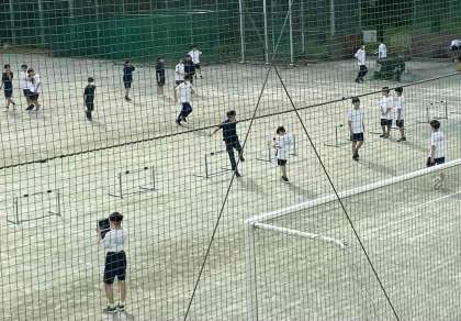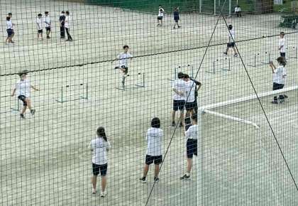 校庭では1年生のハードルの授業。お互いに跳ぶ様子を動画に撮りながら、振り返りをしています。