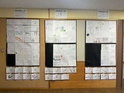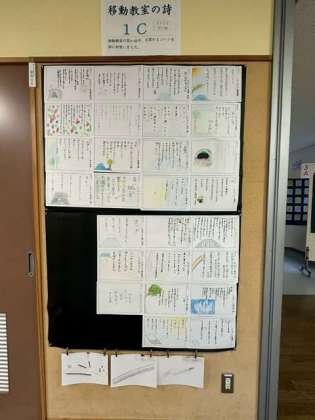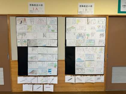 多目的ホールに、河口湖移動教室の思い出などを詩に詠んだ作品を掲示しています。