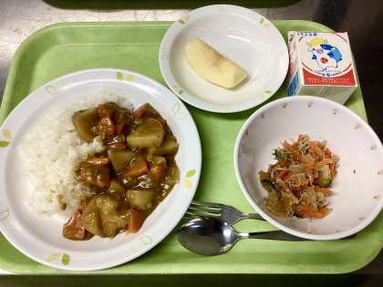 カレーは名前を聞いただけで生徒たちがワクワクするメニューです!しかし、調理に不手際が生じると焦げた匂いがついてしまったり、ルウが溶けずにダマになってしまったりなどが起こることもあります。生徒たちの期待に応えられるように、今日も調理員さんたちが丁寧に作ってくれたことで、無事に美味しく出来上がりました!