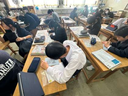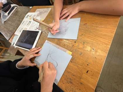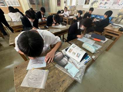 2年生の美術では、スクラッチガラスを制作しています。それぞれが美しいと思うものを選んで、アクリル板に細いニードルで削っています。
