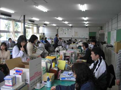 プレハブ校舎2階の職員室では、始業式・入学式などの打合せがビシビシ進