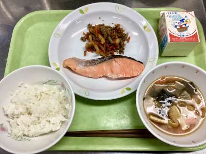 付け合わせは、こちらも定番!「じゃが芋の金平炒め」です!鮭の日には決まってこの金平炒めですが、これには理由があります。鮭はサバやブリなどと比べてカロリーが控えめです。ある意味、ヘルシーでDHAといった魚の栄養もとりやすいのですが、成長に多くのエネルギーを使う生徒たちには、そのカロリー不足を補う必要があります。そこで、ごぼうや人参などの野菜もとれつつ、素揚げしたホクホクのじゃが芋が食べ応えを出してくれる「金平炒め」が、栄養的にも食べ合わせ的にも最適だと思っています。一味唐辛子のちょっとピリッとした感じが、食欲も湧かせてくれます。