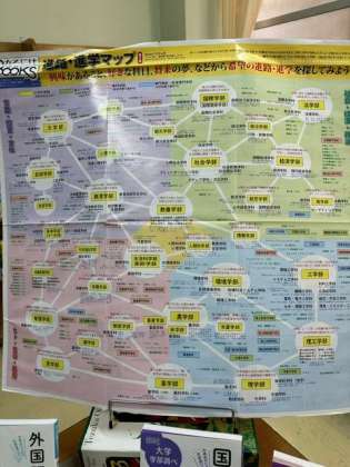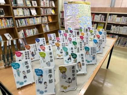 図書館では「上級学校を知ろう」という題で、大学の様々な学部を紹介している書籍を展示しています。将来の進路を考える参考に、どうぞ足を運んでご覧ください。