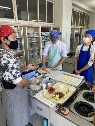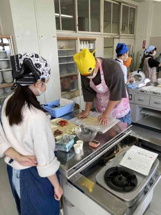 協力しながら野菜を切ったり、小麦粉を混ぜたり。楽しそうです。何ができるのでしょうか。
