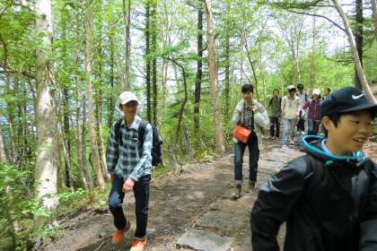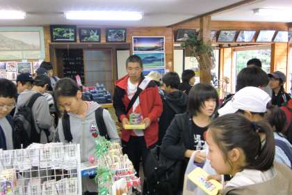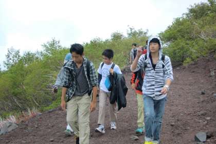 快晴で宿舎から美しい富士山を見ることができました。富士五合目の御中道を歩き、奥庭荘に向かいました。3日目に入ると、連日の寝不足や疲れからか、ハイキング中に時々弱音を吐きながら歩いている人もいました。木々の間から見える、富士5合目からの美しい眺望に、カメラで何枚も写真を撮り、楽しく歩くことができました。奥庭荘でお土産物を買うときは、お店の人に売れ筋商品を聞きながら、迷いながら選んでいました。