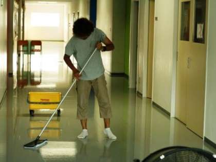 今月に入り、登校する生徒もめっきり減ってきました。この時期を利用して学校主事さんが、廊下の汚れを落とし、ワックスがけをしてくれています。世田谷で一番生徒数が多い学校ゆえ、その汚れを落とすのも大変ですが、この暑さの中、エアコンが効かない廊下で一生懸命作業をされています。このワックスがけは夏休みが終わる8月末まで続けられます。2学期にはピカピカの床に出会えることでしょう。お楽しみに。〔右の写真は、ワックスをかけた後の廊下です。「窓」が床に写っていることがわかります〕(8月6日)