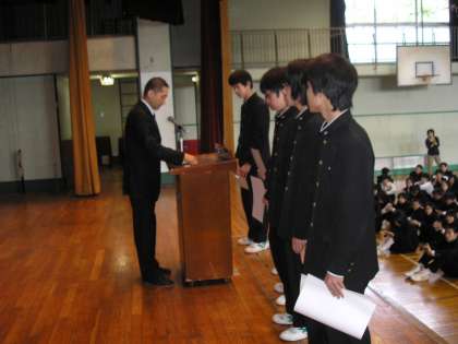 全校朝礼です。1年C組が全校で一番早く整列しました。