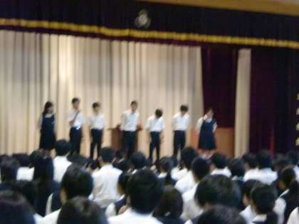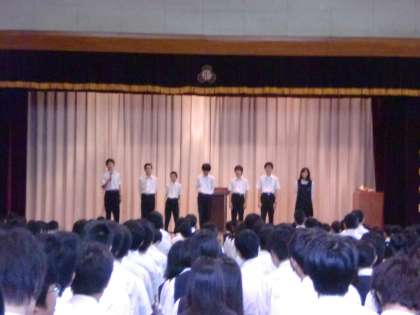 朝礼では、旧生徒会役員と新生徒会役員がそれぞれ壇上に上がり、全校生徒に挨拶をしました。