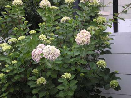 中庭の仮設渡り廊下横にあじさいがあります。まだ色がはっきりしませんが、