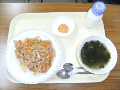 11月26日 スタミナ丼 牛乳 わかめスープ おかしな目玉焼