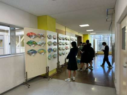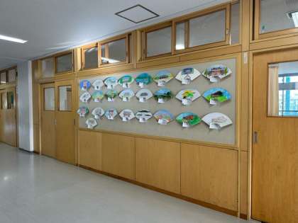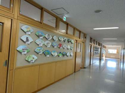 修学旅行で印象に残った場面などを点描画で描いた扇形の作品が完成しました。各教室前や多目的ホールに展示しています。
