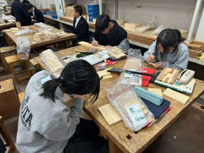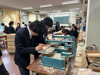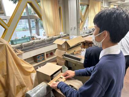 1年生の技術では、木製のティッシュボックスを制作しています。電動糸ノコギリでカットしたり、やすりをかけたりしています。