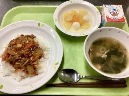 今週もお疲れ様でした!金曜日の給食を飾るのは、大人気の「豚キムチ丼」と「白玉フルーツポンチ」です!きっと疲れていても、休みが多くても食べてくれるだろうと思っていたのですが…。