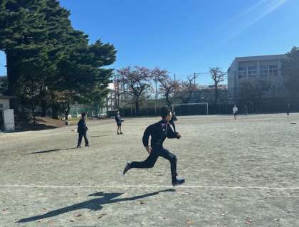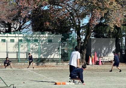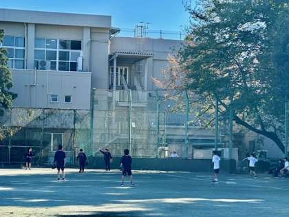 1年生の体育、男子は、運動場でソフトボールです。2面に分かれて試合形式の練習をしています。