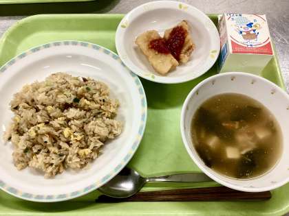 「チャーハン」は今日も美味しい!ラードを入れて炊飯することにより、中華風味がより一層増しています。そのご飯を、半熟になる直前の卵とともに炒め合わせます。いつもながら、調理員さんがきちんと本場のチャーハンと同じ作り方をしてくれるのが、ありがたいです。