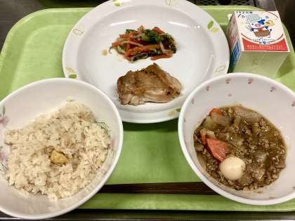 ただ1つ、反省点は…スプーンを付けてあげればよかった!ちょっととろみがついた、しかもうずら卵やひき肉も入った煮物です。食器がお椀で和食メニューといっても、やはりスプーンがあればもっと食べやすかったと思います。今日は給食後、即下校なのでなおさらです。すみませんでした。