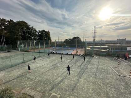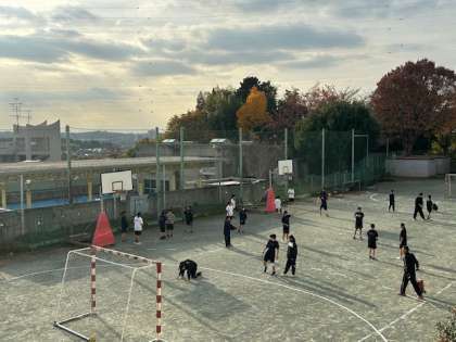 校舎の南側の運動場では、バスケットボール部がハンドボールで練習をしています。その奥では、テニス部が活動しています。
