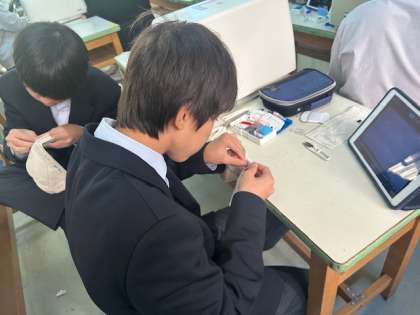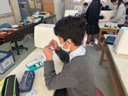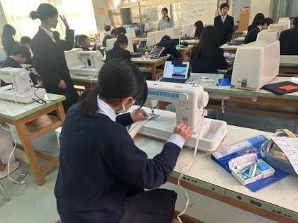 1年生の家庭科は、基礎縫いの練習です。まつり縫いや並縫い,ボタンつけなど動画で確認しながら練習します。ミシン縫いもしていきます。