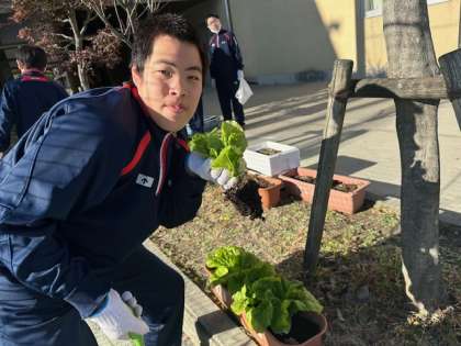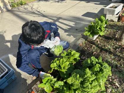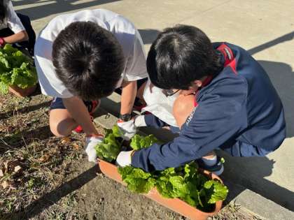 I組では、種から育てたサンチュの収穫をしました。柔らかくて美味しそうに成長しています。