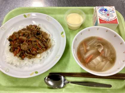 風邪症状による休みが増えています。今日のプルコギ丼は、肉も野菜もたっぷり入った料理です!すりおろしたりんごのタレが、甘辛くて美味しい!春雨スープは、生姜の香りが食欲をそそり、春雨の喉越しがとっても気持ちいいです!そしてあったかい!!