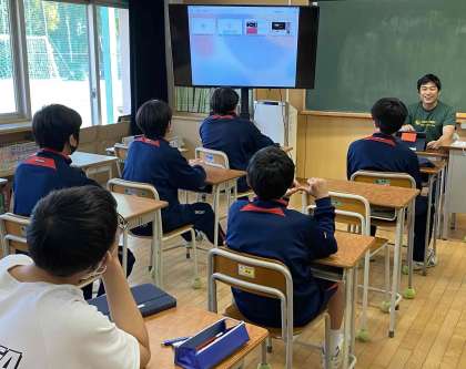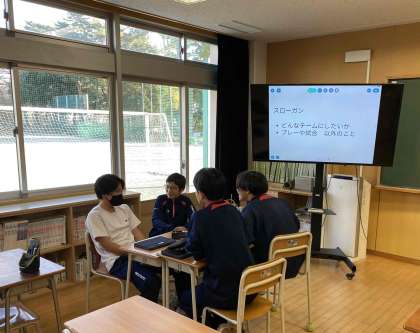 今後のサッカーの試合に向けて、チームとしてまとまっていくためのスローガンや円陣について説明を受けた後、グループで話し合いをしています。