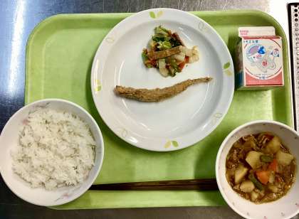 ししゃもフライはいつもサクサクとして、その食感が気持ちいい!食感が気持ちいいと、自然と美味しく感じますね!これで小魚・ししゃもが苦手という生徒も、克服してほしいです。骨ごと食べる小魚は、重要なカルシウム源です。体を大きくするために必要な骨の形成に欠かせないので、しっかりと食べてください!ご飯のおかずとしても、意外に合うんです。