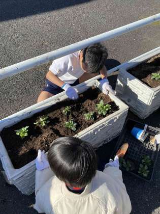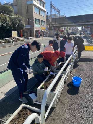 喜多見北部町会の方々にお世話いただき、パンジーの苗を喜多見駅前のプランターに移植しています。