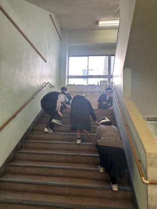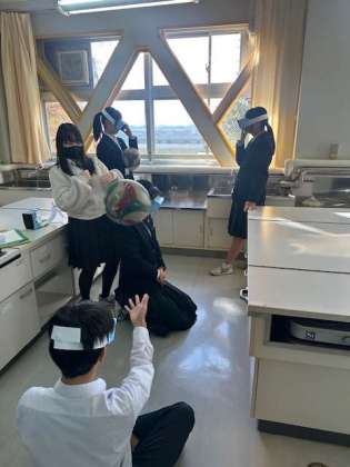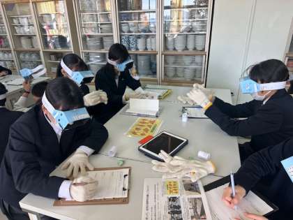 3年生の家庭科では、幼児の視野や感覚を体験する授業をしています。チャイルドビジョンのメガネをかけて階段を上り降りしたり、軍手を2枚重ねて装着したりして折り紙を折ったりします。