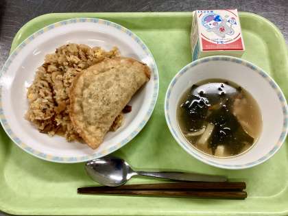 キムチチャーハンは、キムチの辛味と卵、砂糖・コチジャンなどのバランスによって、程よく甘味・辛味を感じる食べやすい味になりました。しかし、朝イチでお米を浸水させるため、こちらは量の調整ができませんでした。いつものチャーハンよりも量が多めになります。こちらでできることは、たくさん食べたくなるくらい美味しく作ること!キムチのシャキシャキ食感が気持ちいい、とっても美味しいキムチチャーハンになりました!調理員さんが半熟直前の卵とご飯を手早く混ぜて作った、自慢のできなので、ぜひ食べてください!