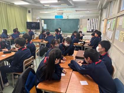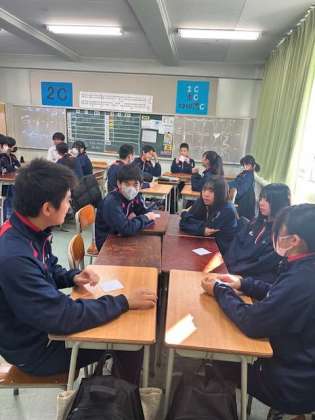 2年生の社会科では、人狼ゲームを使って用語の勉強をしています。各グループで1人だけ違う用語のカードが配られます。質問をし合って、違うカードが配られた人を推理します。どのグループもとても盛り上がっています。