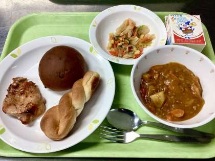 ラストを飾る今日のメニューは、豪勢にパンを2種類使っています。甘くて人気なチョコチップパンと、おかずにも合わせやすいように米粉入りパンです!菓子パン寄りである「チョコチップパン」だけだと、「おかずと合わせる主食」として考えづらいと思われますが、サイズを小さくすれば「食事」の一部としても違和感ありません。元々が学校給食会製品なので、チョコもそれほど多くないのでご安心を。