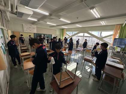 今日の午後は美化デーです。各クラスや廊下、階段、玄関や特別教室など、担当に分かれて丁寧に清掃しています。