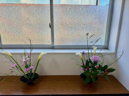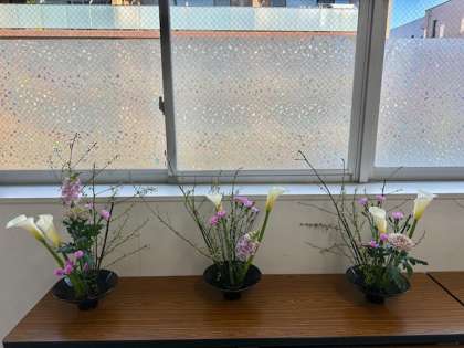 日本文化部では、昨日、松花古流の生け花のお稽古をしました。花材は、青文字、カラー(海芋)、撫子です。1年生は横態型本勝手の3回目です。2年生は立態型逆勝手のお稽古をしました。