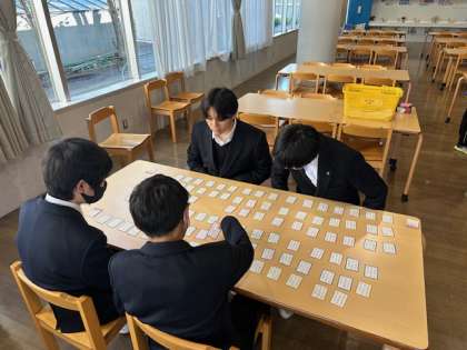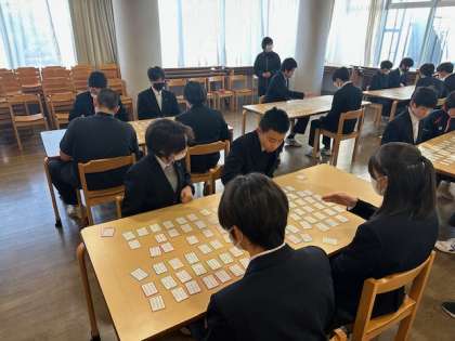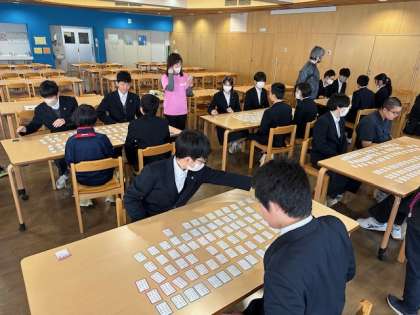 今日の1時間目、I組では、ランチルームで百人一首をしています。