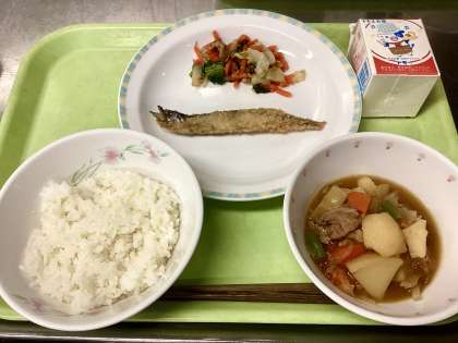 特にししゃもフライは、成長に欠かせない貴重なカルシウム源です。そのため、毎月出ます。魚丸ごとに抵抗のある生徒も食べてもらえるように、そして骨ごと食べることに戸惑いがなくなるよう、食べやすい「フライ」にしております。今日もしっかりよく噛んで食べてください!