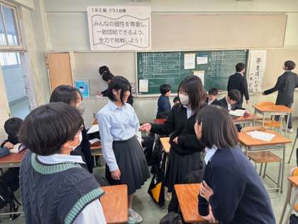 1年生の昼休みの教室の様子です。みんな楽しそうな笑顔です。