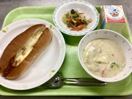 副菜のサラダは、口の中をさっぱりさせるのにちょうどいい!ごまの風味がきいたドレッシングも、野菜によく合っています!最近、キャベツの値上がりがすさまじいですね。ぜひ、給食で出た時はたくさん食べてください!
