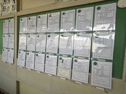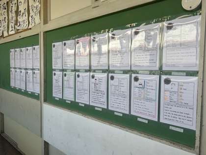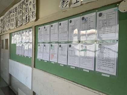 1年生の教室前の廊下に、英語での自己紹介のカードを掲示しています。どうぞご覧ください。