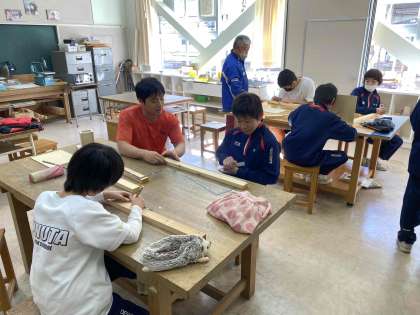 木工の授業では「作品ボックス」の製作に向けて、木材を測ったり線を引いたりしています。